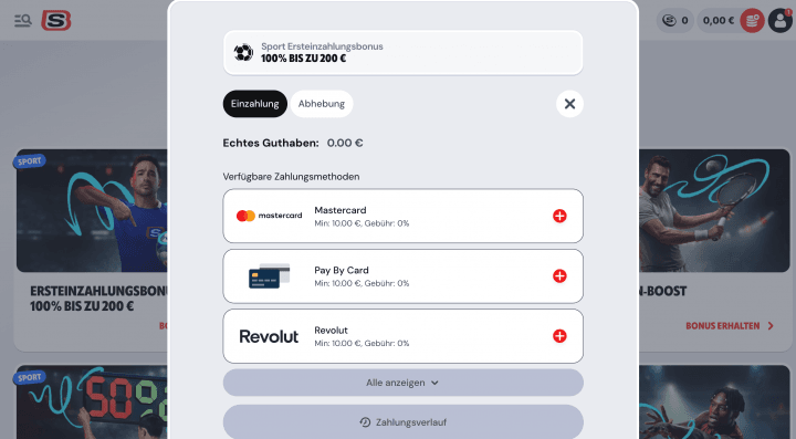 - Direkt im Anschluss gelangst du in den Kassenbereich. Dort wählst du deine bevorzugte Zahlungsmethode aus und tätigst die Mindesteinzahlung. Sobald die Einzahlung abgeschlossen ist, werden dein Guthaben und der Bonus automatisch deinem Konto gutgeschrieben.