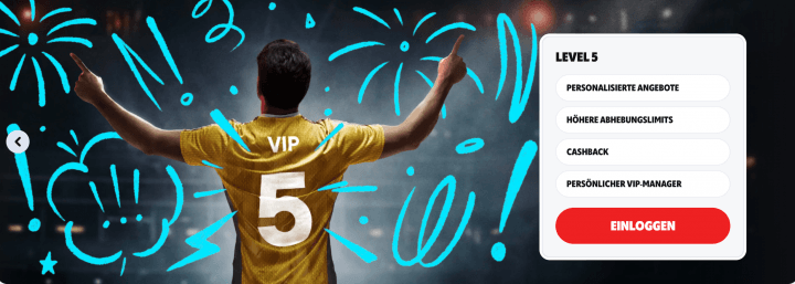 Zusätzlich zum Treueprogramm gibt es ein mehrstufiges VIP-Programm, das auf deinem Fortschritt basiert. Insgesamt stehen dir fünf Level zur Verfügung. Mit jedem Erreichen einer neuen Stufe erhältst du dann weitere Vorteile. Dazu gehören unter anderem ein täglicher Cashback Bonus ab der 2. Stufe, ein VIP-Manager sowie exklusive Aktionen und Bonusangebote. Ein weiterer Vorteil sind auch höhere Auszahlungslimits.
