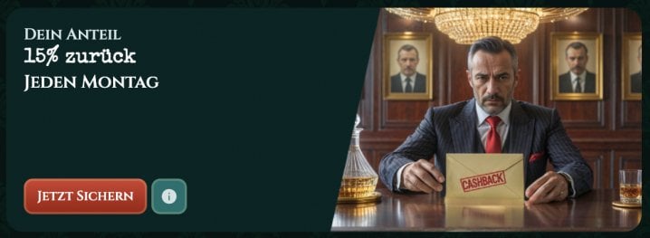 Immer montags wird ein Cashback Bonus gutgeschrieben, wenn du dafür qualifiziert bist. Dieser berechnet sich anhand des aktuellen Status im Treueprogramm, das wir gleich noch genauer erklären werden. Jeder Stufe wird 1% hinzugerechnet. Es ist möglich, bis zu 15% Cashback zu erhalten, da die letzte Stufe Slotfather nicht regulär berechnet wird, sondern dir ein individuelles Cashback angeboten wird. Du startest also bei 1% und steigerst dich dann mit jeder Stufe. Der Mindestbetrag, der gutgeschrieben wird, liegt bei 5€ und deine Nettoverluste der Vorwoche dienen als Berechnungsgrundlage.