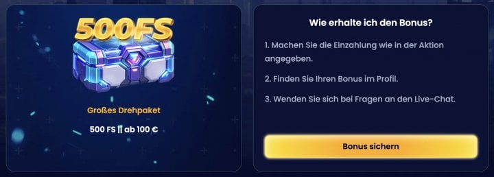 (Mindesteinzahlung 100€; Freispiele werden an fünf unterschiedlichen Slots gutgeschrieben)