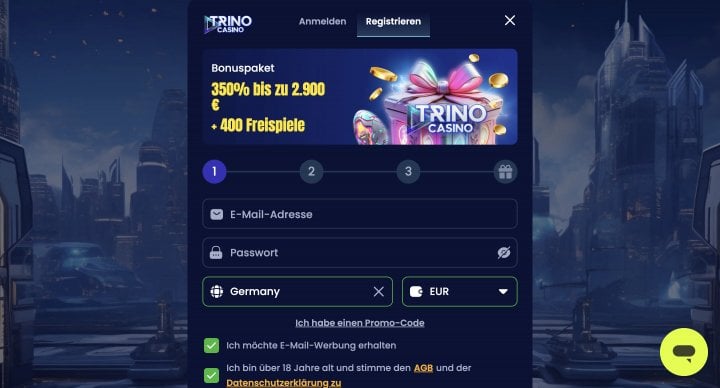 - Sofern du noch kein Spielerkonto im Trino Casino hast, klicke einfach auf unseren Link. Wir leiten dich dann auf die Website weiter, um mit der Registrierung zu starten.