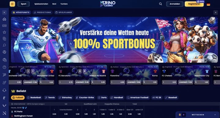 Das Wettangebot bei Trino Casino ist breit aufgestellt und umfasst sowohl klassische Sportwetten als auch einen eigenen Bereich für E-Sports. Im Sportbereich findest du vor allem Fußball im Fokus, ergänzt durch Disziplinen wie Basketball, Tennis oder Eishockey. Die Struktur ist übersichtlich aufgebaut, sodass du schnell zwischen Ligen, Spielen und Wettmärkten wechseln kannst.