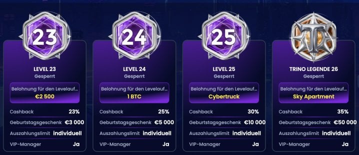 Mit dem Treueprogramm im Trino Casino kannst du dir weitere Boni und Cashback von bis zu 35% sichern. Das VIP-Programm umfasst insgesamt 26 Stufen. Bereits nach dem Erreichen der 2. Stufe startet dabei der wöchentliche Cashback, der anfangs 2% beträgt. Der Cashback wird dir jeweils am Montag als Echtgeld gutgeschrieben und ist an keine Bonus- und Umsatzbedingungen geknüpft.