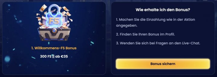 (Mindesteinzahlung 35€, Freispiele werden an fünf unterschiedlichen Slots gutgeschrieben)