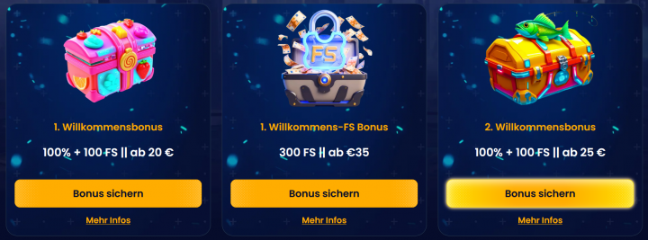 Mit deiner ersten Einzahlung werden dir jeweils 20 Freispiele an den Spielautomaten Luck Of Tiger Bonus Combo, Le Viking, Le King, Gates of Olympus und Pirots 4 gutgeschrieben. Den jeweiligen Bonus findest du nach der Gutschrift direkt in deinem Profil. Einen Trino Casino Bonuscode benötigst du nicht für die Aktivierung. Du kannst dich ebenso für einen Wettbonus entscheiden.