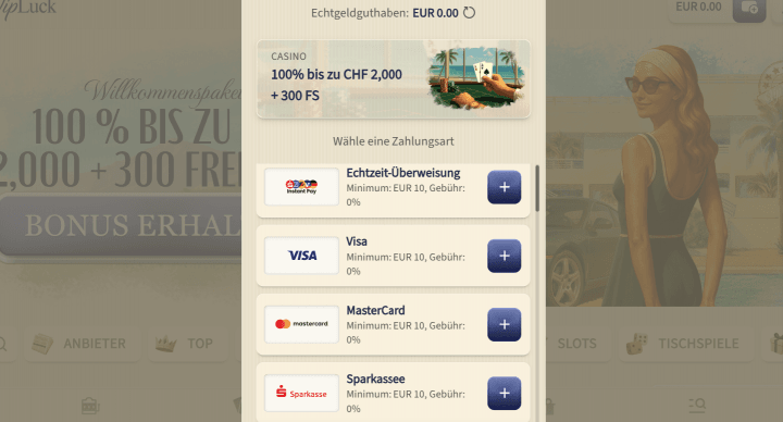 Besonders positiv sind uns die vielfältigen Zahlungsmethoden aufgefallen, die das VipLuck Casino für Ein- und Auszahlungen anbietet. Mit den meisten Einzahlungsmethoden ist eine Einzahlung bereits ab einem Betrag von 10€ möglich. Einige Kryptowährungen hingegen setzen eine Mindesteinzahlung zwischen 15€ und 55€ voraus.