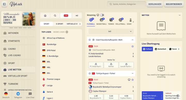 Der Wettbereich des VipLuck Casinos ist klar strukturiert und deckt ein breites Spektrum an klassischen Sportarten ab. Im Bereich des Wettangebots findest du dich schnell zurecht, da Ligen, Events und Wettmärkte entsprechend gegliedert sind. Neben bekannten Top-Ligen sind auch internationale Wettbewerbe vertreten, was für eine gute Auswahl sorgt. Die Quoten werden übersichtlich dargestellt und lassen sich direkt vergleichen, ohne dass die Oberfläche überladen wirkt.