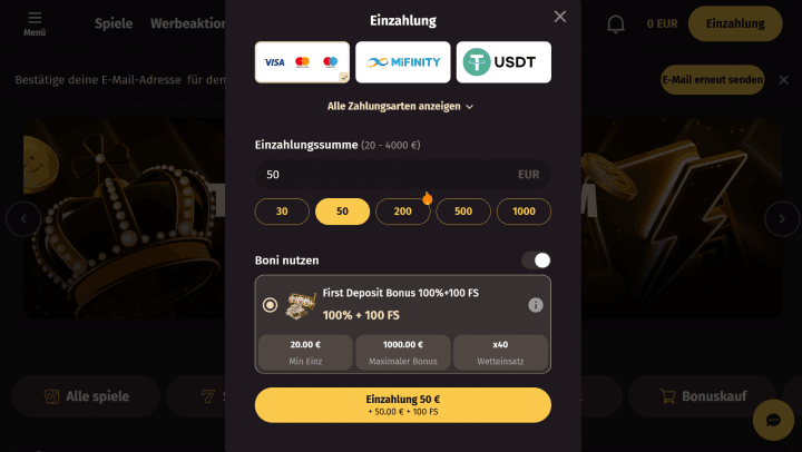 Die Mindesteinzahlung beträgt bei den meisten Standard-Zahlungsarten 20€, während bei Krypto teilweise geringere Beträge möglich sind. Zusätzliche Gebühren für Einzahlungen werden nicht berechnet.