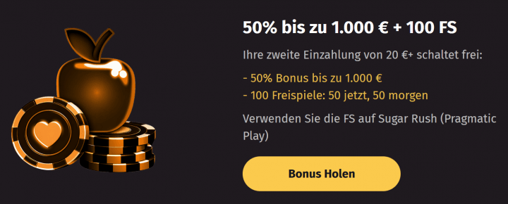 Jeden Dienstag kannst du je nach Höhe deiner Einzahlung bis zu 150 Freispiele erhalten. Mit einer Mindesteinzahlung von 40€, 70€ oder 110€ jeweils 50, 80 oder 150 Freispiele. Gib hierzu einfach den entsprechenden Bonuscode FS50, FS80 bzw. FS150 bei deiner Einzahlung an.