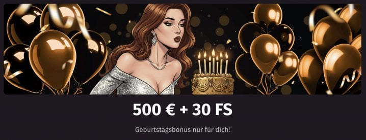 An deinem Ehrentag, deinem Geburtstag, stehen dir ein 100% Bonus bis zu 500€ sowie 30 Freispiele bereit. Hierzu erhältst du per E-Mail einen Aktionscode, den du mit einer Mindesteinzahlung von 30€ im Kassenbereich einlösen kannst.