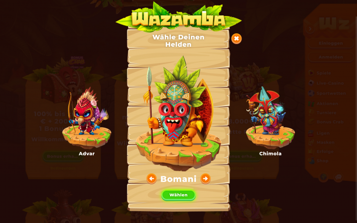 - Als Erstes auf der Webseite klickst du auf den grünen „Anmelden“-Button im oberen Bereich des Menüs. Du musst dich für einen der drei „Helden“ entscheiden, die wie ein Avatar funktionieren, bevor du zu den angebotenen Willkommensboni kommst. Suche dir den passenden aus, denn ein nachträgliches Ändern ist nicht möglich.