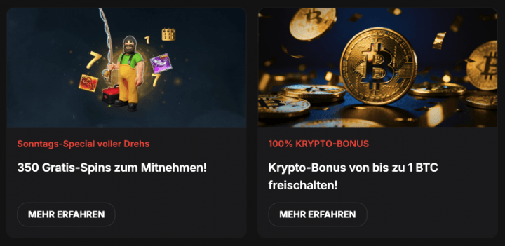 Zum Abschluss der Woche bietet Wettson Casino eine Aktion mit 350 Gratis-Spins an. Voraussetzung ist, dass du im Slot-Bereich Einsätze ab 100€ tätigst und die Aktion zuvor auswählst. - 100% Krypto Bonus bis zu 1 BTC (dreimal wöchentlich)