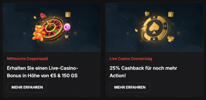 Am Donnerstag bietet das Wettson Casino einen 25% Cashback Bonus im Live Casino an, der mögliche Verluste bis zu 150€ teilweise ausgleicht. Das Angebot gilt für alle Live Dealer Spiele.