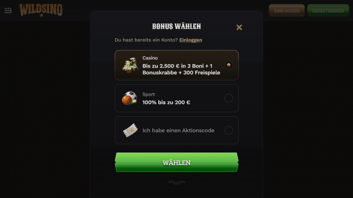 - Im nächsten Schritt entscheidest du dich für das gewünschte Bonusangebot. Alternativ kannst du einen Wildsino Bonuscode eingeben oder bewusst auf einen Bonus verzichten. Anschließend bestätigst du deine Auswahl mit einem Klick auf “Weiter”.