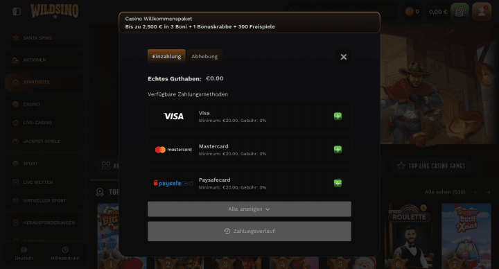 Die Mindesteinzahlung im Wildsino Casino beträgt 20€. Je nach gewähltem Zahlungsanbieter kann dieser Betrag im Einzelfall auch höher angesetzt sein. Vor der Einzahlung werden dir die jeweiligen Limits transparent angezeigt, sodass du jederzeit weißt, welcher Betrag erforderlich ist, um eine Einzahlung erfolgreich durchzuführen.