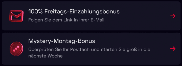 100% bis zu 1.000€ jeden Freitag ab einer Mindesteinzahlung von 30€. - Mystery-Montags-Bonus