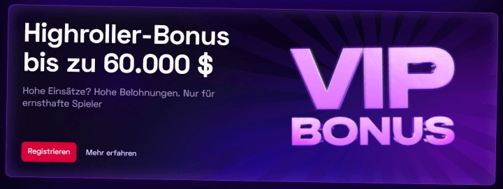Ab einer Einzahlung von 2.000€ qualifiziert man sich als VIP-Spieler und kann damit von exklusiven Bonusangeboten Gebrauch machen. Außerdem wartet dann ein VIP-Manager, als direkter Ansprechpartner, der rund um die Uhr zur Verfügung steht. Du kannst bereits bei deiner Ersteinzahlung als Highroller durchstarten und dir damit einen Bonus von bis zu 60.000€ sichern.