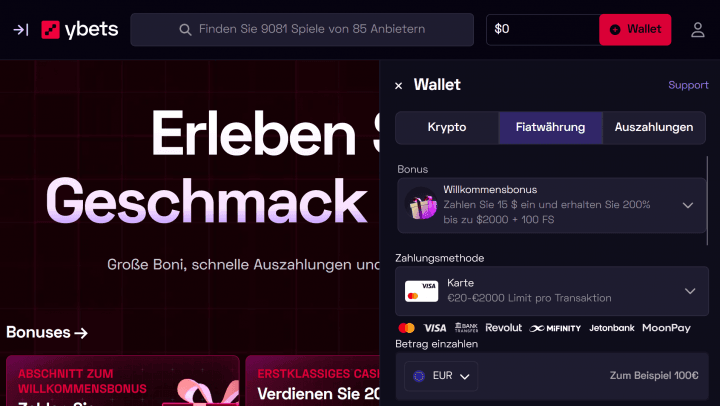 Ybets ist vor allem im Bereich der Kryptowährungen gut aufgestellt, sodass man es als Crypto Casino bezeichnen kann. Aber keine Sorge, man kann auch klassische Zahlungsmethoden für verschiedene Fiatwährungen nutzen. Die Zahlungsoptionen für dein Geld können sich je nach Land verändern und variieren. Ebenso die Mindesteinzahlungen, die bei etwa 15€ liegen oder eben dem Gegenwert in Krypto. Bei der Auswahl an Zahlungsmethoden kann man den jeweils notwendigen Betrag noch einmal finden.