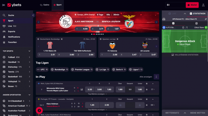 Sofern du dich auch für Sportwetten interessierst, findest du bei Ybets eine Vielzahl unterschiedlicher Wettmärkte wie Fußball, Handball, Eishockey, Tennis, Basketball und Boxen. Aber auch Randsportarten wie Futsal, Badminton, MMA und Lacrosse sowie Politik und Segeln sind verfügbar. Dabei haben wir in unseren Ybets Casino Erfahrungen überdurchschnittliche Wettquoten vorfinden können sowie die Möglichkeit, Live Wetten zu platzieren. Ein Wetteinsatz ist bereits ab einem Betrag von 0,01€ möglich.