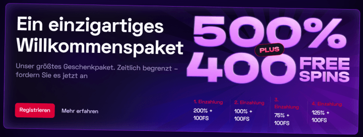 - Willkommenspaket mit bis zu 500% und 400 Freispielen