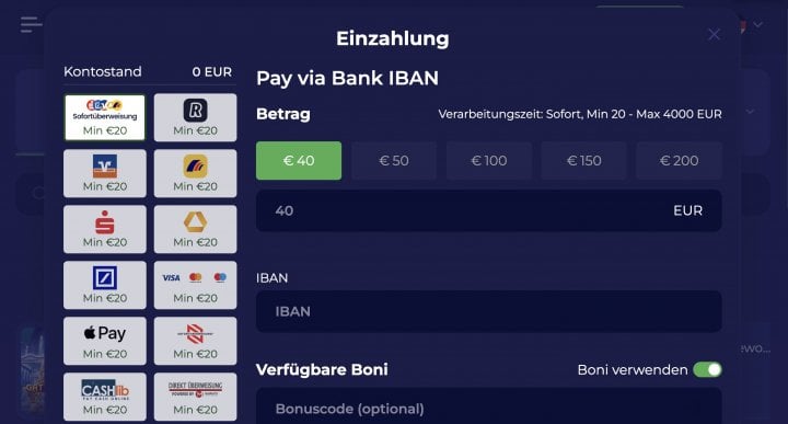 Ein praktisches Detail ist die Möglichkeit, direkt im Zahlungsfenster einen Bonuscode einzugeben. Wenn du also ein spezielles Angebot nutzen möchtest, kannst du den entsprechenden Code unmittelbar bei der Einzahlung aktivieren.