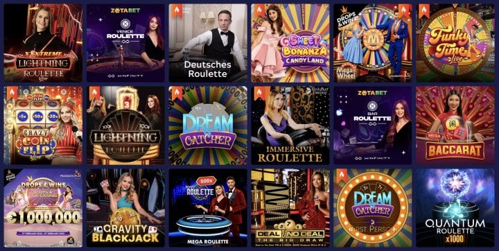 Für ein umfassendes Spielerlebnis sorgt bei ZotaBet die Vielzahl integrierter Spielehersteller. 122 Provider sind auf der Plattform vertreten, darunter NetEnt, Nolimit City, Hacksaw Gaming, Winfinity, Relax Gaming, Amatic, Leander, Octoplay und Slotopia. Zur Auswahl stehen dir dabei klassische Spielautomaten, Video Slots, eine umfassende Anzahl an Live Casino Spielen sowie ein Wettangebot.