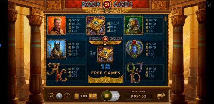 Book of Gods hat 5 Walzen, 3 Reihen und 10 Gewinnlinien. Bei diesem Spielautomaten gibt es automatische Drehungen, man kann die Musik einstellen und sogar einen "Reality Check" nutzen, mit dem man sein Gameplay einstellen und sicherstellen kann, dass man nicht zu lange spielt.