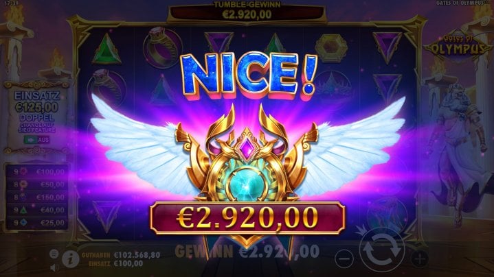 Sofern Sie Ihre Einzahlung erfolgreich getätigt haben, wird Ihnen der Einzahlungsbetrag umgehend gutgeschrieben. Nun können Sie zur Spielauswahl des Casinos wechseln und dort den Pragmatic Play Video Slot Gates of Olympus aufrufen. Schon mit einem minimalen Einsatz von 0,20 Euro können Sie am Game teilnehmen. Dort finden Sie ebenso viele weitere Spiele des Anbieters Pragmatic Play.