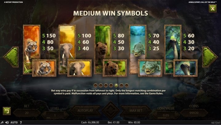 Die Gewinne werden von links nach rechts berechnet, wobei man die Walzen 1-2-3 für eine Kombination aus 3 Symbolen, 1-2-3-4 für 4 Symbole und 1-2-3-4-5 für 5 Symbole braucht. Der Tiger ist der König in diesem Dschungel und zahlt 150, 80 oder 50 Münzen, die dann mit dem "Einsatzlevel" multipliziert werden, wenn Sie 5, 4 oder 3 Münzen über die 5 Walzen treffen. Die niedrigste Auszahlung hat man bei einer Kombination aus 10-ern, die 30, 20 oder 10 Münzen pro Linie für 5, 4 oder 3 Stück bezahlen.