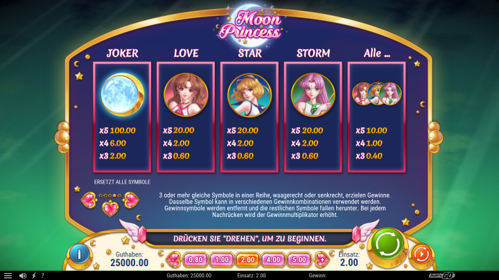Der Slot Moon Princess ist von der Anime-Serie Sailor Moon inspiriert und zeigt neben typischen Symbolen vor allem 3 Prinzessinnen, die Superkräfte haben und dir bei deinem Spiel helfen sollen. Das Design ist ansprechend, und hier wird jeder Anime-Fan seine Freude haben. Generell spielst du auf einem 5x5 Raster, es gibt Multiplikatoren und zudem noch einige Features, auf die wir später noch eingehen werden. Der Play'n GO Slot ist übersichtlich angeordnet, sodass du unterhalb des Spielfelds deinen Einsatz einstellen kannst.