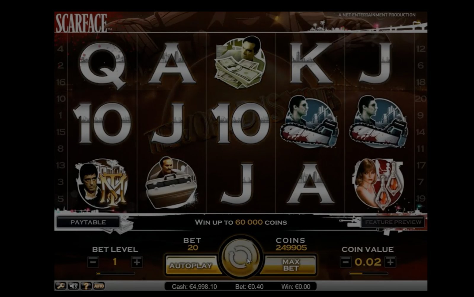 Scarface ist ein Spielautomat mit einem 5x3 Layout und insgesamt 20 Gewinnlinien, die für Ihre Kombinationen zur Verfügung stehen. Die weniger guten Symbole sind die traditionellen Spielkarten von 10 bis Ass. Die besseren Symbole sind alle folgenden Symbole mit Bezug zum Film: Koffer, Geld, Kettensäge, Ohrringe und schließlich das Tony-Montana-Abzeichen. Es bietet mit dem 2.000fachen für Ihren Einsatz die größte Auszahlung im Basisspiel, wenn Sie fünf davon auf einer aktiven Gewinnlinie landen können.