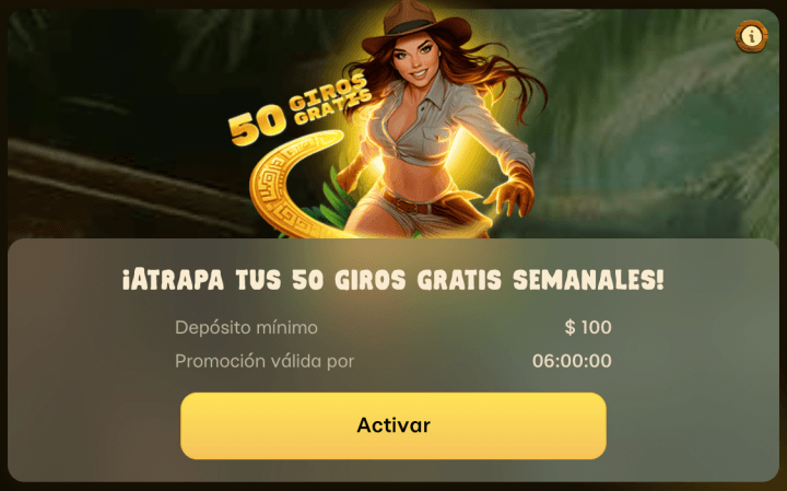 - 50 giros gratis a la semana por un depósito de 5 USD o más. Rollover de 25x.