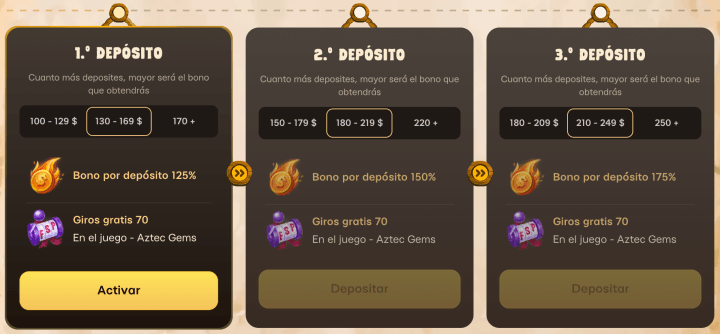 | 2do depósito | 125% + 30 giros gratis | 150% + 70 giros gratis | 175% hasta 2.000 USD + 100 giros gratis |