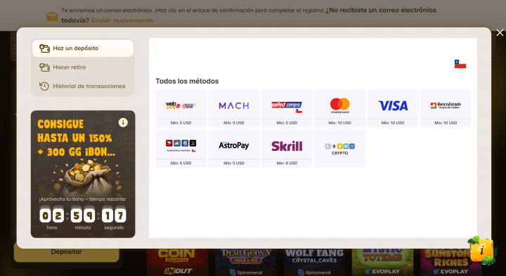 También es importante que hagas un depósito si quieres recibir el bono de bienvenida. Esto lo haces así: Clica en Depósito > Elige un método de pago > Completa el formulario de pago > ¡Listo! Tu bono de bienvenida estará listo para usarse.