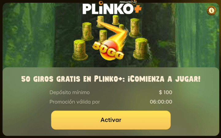 - 50 giros gratis en Plinko+ por depositar al menos 5 USD. Rollover de 25x.