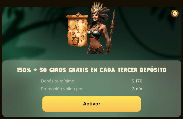 - 150% hasta 500 USD por cada tercer depósito realizado, que deberá ser de al menos 10 USD. Debes activarlo un día y depositar, luego repetir depósitos en el segundo y tercer día para cobrar al tercer depósito. Rollover de 25x.