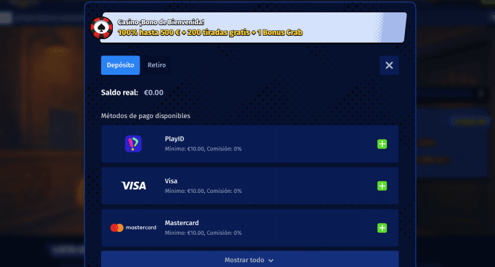 Para pagar, elige un método y un monto de pago. Luego, completa el formulario de datos de pago y procesa el pago como lo indica el casino. El dinero se acredita inmediatamente y puedes comenzar a jugar, sin demoras ni comisiones.