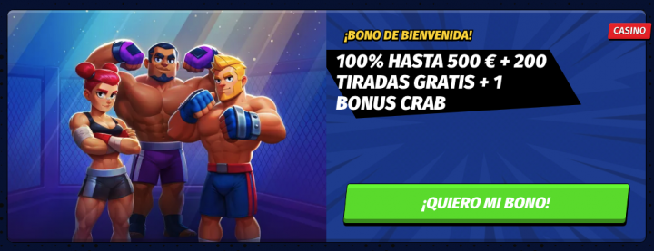 Detalles del bono de bienvenida: 100% hasta 500€ + 200 tiradas gratis y un intento de bonus crab