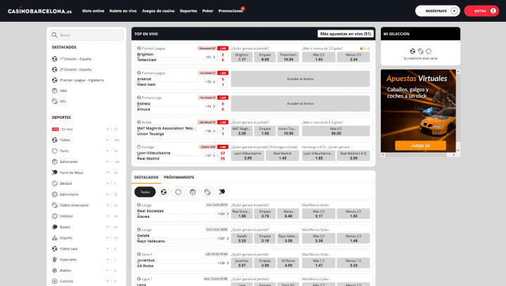 Al ingresar a esta sección, nos encontramos con una interfaz intuitiva y fácil de navegar, destacando eventos deportivos actuales y próximos. Casino Barcelona ofrece una amplia gama de opciones de apuestas de deportes populares como el fútbol, tenis y el automovilismo. Además, cubren una variedad de eventos nacionales e internaciones, asegurando que los aficionados a las apuestas deportivas tengan un abanico extenso de opciones.