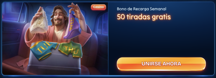 De lunes a jueves puedes depositar y obtener un bono de recarga semanal de 50 tiradas gratis. Este bono se activa con un depósito de solo 20€ o más, y se libera cumpliendo el rollover de 40x veces el valor de las ganancias de las tiradas gratis.