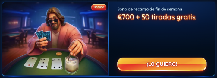 Luego del bono de recarga semanal, tendrás a la mano un bono de viernes a domingo: el bono de recarga de fin de semana. Este bono te dará el 50% de tu depósito hasta 700€ + 50 tiradas gratis. Puedes depositar al menos 20€ para recibir el dinero del bono, y si quieres añadir las tiradas gratis, deberán ser al menos 50€. Las condiciones para liberarlo son idénticas a las del bono de bienvenida.