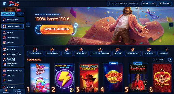 Dudespin es una plataforma diseñada con una temática de bolos que combina una paleta de colores nocturnos con colores que contrastan en forma de luces de neón. Más que un sitio diseñado con este estilo, Dudespin incluye todo un apartado de beneficios y minijuegos de bolos donde obtienes más premios, lo que lo hace un sitio gamificado. La interfaz es muy limpia y bonita, y navegar por ella es realmente satisfactorio, ya que combina un buen diseño con un sitio optimizado para funcionar con total fluidez.