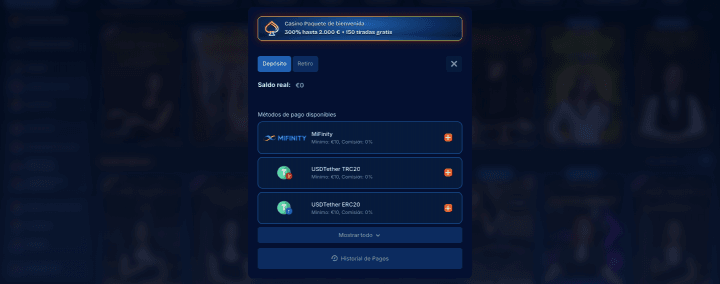 Los depósitos mínimos en Dudespin son de al menos 10€, mientras que el máximo varía entre métodos, llegando a ser de hasta 5.000€ por transacción. Cuando eliges un método de pago, se despliega una ventana extra donde debes completar el proceso de pago. Una vez que pagues, el dinero se refleja inmediatamente en tu cuenta, sin comisiones.