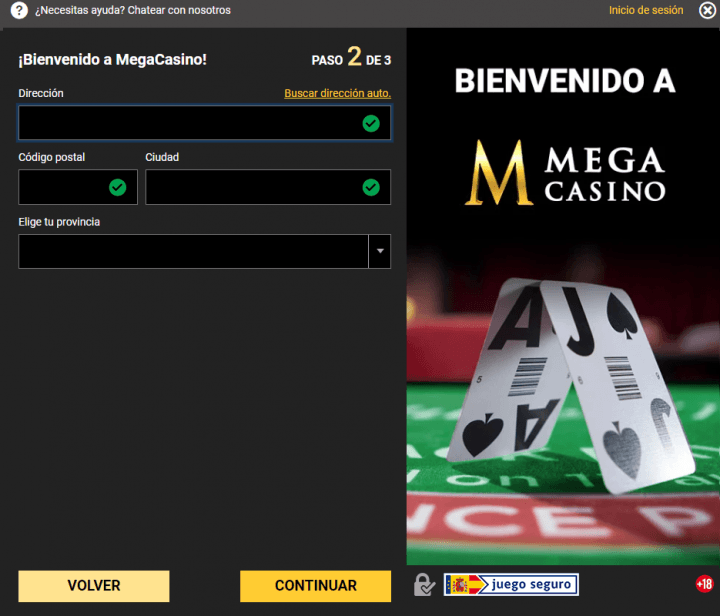 Nuevamente, la interfaz del sitio web falla en aspectos básicos de Mega Casino. Al momento de intentar registrarnos, nos muestran que será un proceso de 3 pasos. Sin embargo, es más bien de 5 pasos. Algunos pasos, como el primero, están divididos en dos.