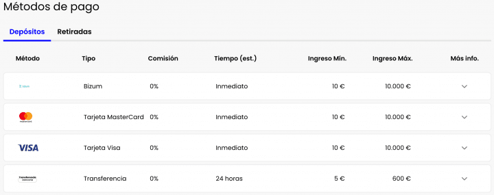 - Depósitos desde 5€ y retiradas sin límite mínimo