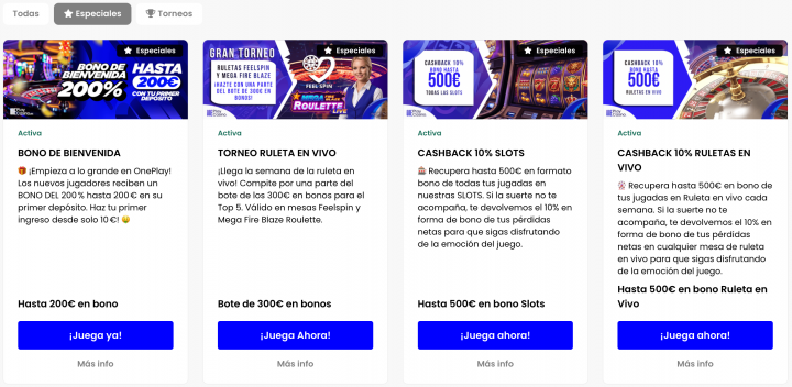 Te recomendamos acceder a la pestaña de Promociones en cada sesión de juego que comiences. En OnePlay no hay muchas promociones fijas, pero sí un montón de bonos temporales que puedes usar durante la semana. En 3 meses de prueba, encontramos tiradas gratis, reembolsos semanales, bonos de recarga y un montón de torneos con pozos de premios millonarios. Te recomendamos mantener activadas las alertas mediante correo electrónico para recibir cualquier nueva oferta venidera.