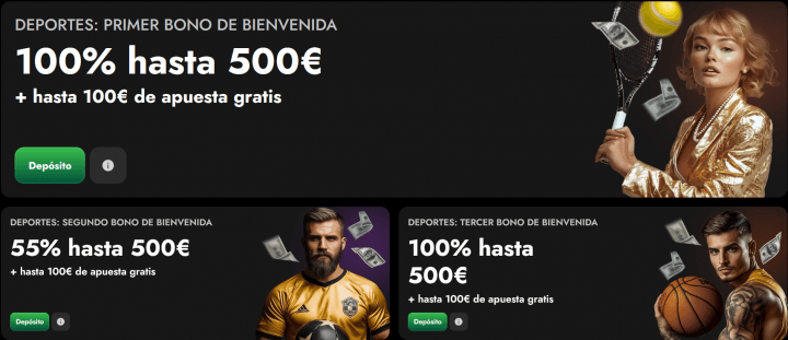 En su casa de apuestas, el bono de bienvenida cubre en un 55%-100% tus primeros 3 depósitos hasta sumar 1,500€ + otros 300€ en freebets. Solo tienes que depositar al menos 20€-50€-100€ en cada uno de tus primeros 3 depósitos y cada depósito se cubrirá de la siguiente forma: