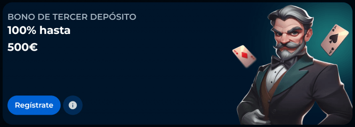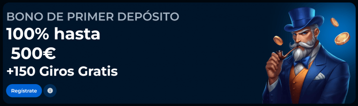 - 100% de tu primer depósito hasta 500€ + 150 tiradas gratis.