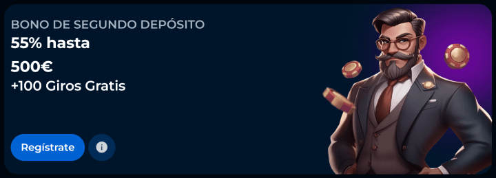 - 55% de tu segundo depósito hasta 500€ + 100 tiradas gratis.