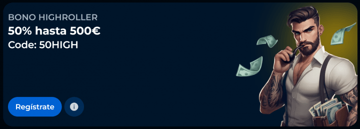 Utilizando el código 50HIGH, vas a recibir el bono de bienvenida del 50% hasta 500€. Solo debes depositar al menos 300€ y luego cumplir un rollover de 35x en 7 días, tal y como funciona el bono de bienvenida estándar.